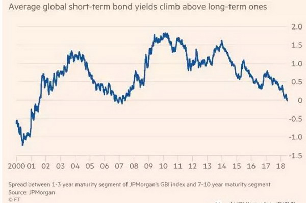 经济周期研究所的联合创始人Achuthan从一个匪夷所思的地方发现了全球经济早已放缓的信号。其指出,动物皮张和橡胶等非交易所交易的工业材料通常是生产线上的第一项产品,其价格走势是经济活动的晴雨表。然而,大宗商品的价格分歧正在掩盖全球经济放缓的迹象。我们以石油和铜为例。这些备受关注的交易所交易商品因异常事件导致的供应削减而价格激增,例如:委内瑞拉原油产量的大幅下降。整体上,对石油或工业金属等产品供应的负面冲击,以及各种各样的冲击一起袭来,令经济产生假象:看上去比实际情况更加强劲。这实际上得到了一些经济数据的支持,例如:欧洲最大的经济体——德国,上周公布的制造业PMI初值降至18个月以来最低,拖累了欧元区整体制造业数据的表现。 信号二:全球债券收益率曲线出现2007年以来首次倒挂 英国《金融时报》发现了一个可能更悲观的信号:摩根大通全球政府债券指数(GBI)1-3年期与7-10年期的平均收益率曲线已经倒挂了,是2007年以来首次。 有分析人士指出,由于美债构成了摩根大通全球政府债券指数(GBI)1-3年期指标的一半多,全球国债收益率曲线倒挂大部分是技术性原因。然而,美联储研究发现,过去美国六次经济衰退都承接在收益率曲线倒挂之后。 《金融时报》文章称,全球收益率曲线十多年来惊现倒挂,不应仅被视为一个技术性的异常指标,还是应该引起投资者高度重视。因为这表明在全球整体水平上,投资者持有更长期的国债不再产生足够的溢价,说明人们对未来全球经济走势和股市走向都更加不乐观。 文章出自顶点财经宏观策略导师徐阳 |