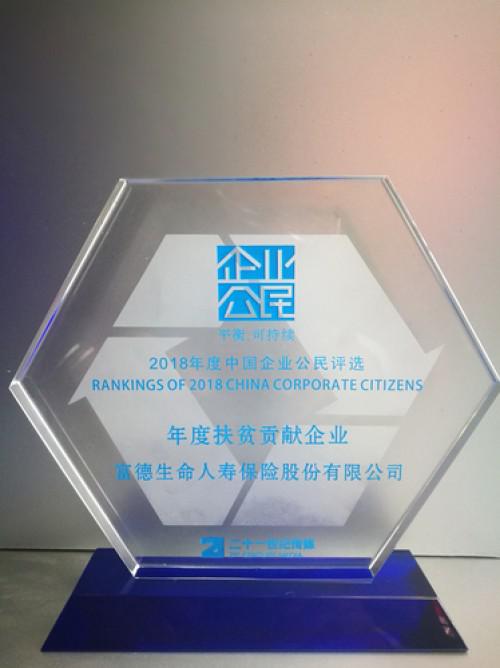 近日,由《21世纪经济报道》主办的第十五届中国企业公民论坛暨2018年度中国企业公民评选颁奖盛典在北京举行,富德生命人寿凭借长期公益项目——“小海豚计划”独特的创新扶贫模式,获颁“年度扶贫贡献企业”奖。