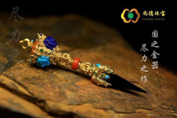 尚德珠宝首发推出金刚杵,让世人知晓它的用途和意义。而金刚杵是密宗常用的法器。金刚比喻坚固不坏之性,密乘中作为不生不灭之佛性的表法。最常用的五钴金刚杵表示五方五佛的智慧功德,也表示五方空行。五钴金刚杵就是五方五佛与五方空行双运的表法,象征自性明空的本体功德。金刚铃表示五方五佛自性功德任运的妙音,这是本体与妙用双运的表法,简单来说,就是方便与智慧一体无二的表法。一般金刚杵与金刚铃合用,即左手持铃,右手持杵。金刚铃是发音器物,常有令人惊觉、警悟之意。在和金刚杵一起使用时,两者比附一阴一阳,互相补充,使佛性更为完备。