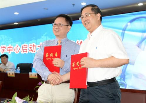 2017年8月13日,广东省茂名市人民医院行政负责人梁岩(右)与国盛医学董事长邓杏飞签约共建茂名市人民医院精准医学中心。