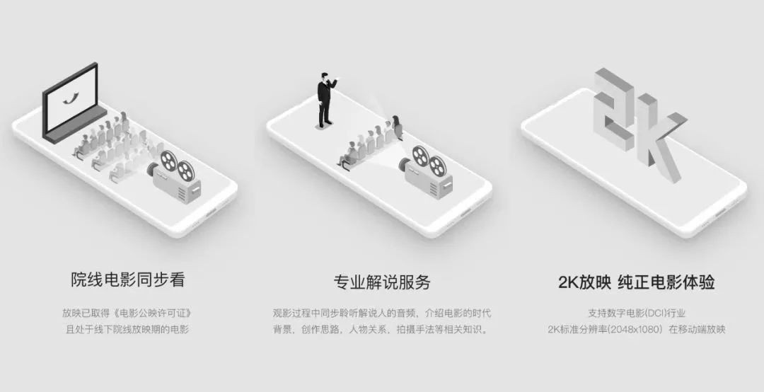 移动电影院基本服务 通俗地讲,手机等移动终端就变成放映机,手机等移动终端的屏幕就变成电影的银幕,通过手机+不同的场景构建出独一无二、个性无限的私人电影院。看电影将变为随时随地触手可及的事情。2019年5月9日2019年5月9日,移动电影院V2.0产品在北京正式发布,在观影社交化、科技化和国际化方面升级了观影体验。这标志着电影新时代的到来。 观影社交化 移动电影院V2.0推出了“约亲友”、“约影迷”、“专业场”、“首映礼”等不同场景选择,在打造“个性化观影”的同时,兼顾用户在不同场景下的观影需求,实现了用户的“观影社交化”。每位电影观众都可以根据自己的社交喜好,自由选择二人、百人和千人模式,进行观影社交的深度体验。