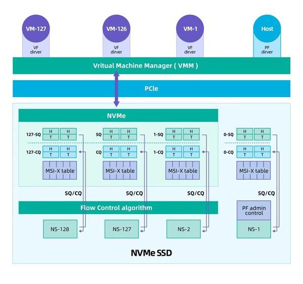 浪潮SSD 什么是SR-IOV? SR-IOV,是一个外围组件快速互连(PCIe)的标准体系结构。基于这种结构,上层系统的虚拟层可以对服务器存储盘IO进行管理及共享。传统IO虚拟化方案占用PCIe插槽硬件和CPU资源较多且具有高延迟、低性能、低隔离性等短板,能克服这些痛点的基于SR-IOV硬件I/O虚拟化解决方案迎来广阔的市场空间。 例如,某互联网一线云服务供应商,可以提供不同的云硬盘出售服务,包括提供不同容量、带宽、IOPS的QoS服务。一个宿主机支持多个提供SSD存储服务的虚拟机,并且SSD的容量(50G/100G/150G等)可以由终端客户(虚拟机的购买者)进行自主选择,同时要求每个虚拟机都要保证服务质量。这就对SSD设置了技术"门槛":其一SSD要实现性能隔离,每个Mini-SSD使用特定额度的性能且互不影响;其二SSD要能支持QoS控制,实现性能分售,保证每个Mini-SSD性能负载均衡;其三,达到性能极限,让多个Mini-SSD性能总和贴近一个完整SSD的性能,最大化发挥硬件资源潜力。 浪潮SSD:基于SR-IOV,释放闪存潜力 针对互联网用户需求,浪潮存储基于第二代自研PCIe 4.0 NVMe SSD实现I/O虚拟化(SR-IOV)功能,支持1个物理功能(PF)和127个虚拟功能(VF)。浪潮SSD能够将主控所支持的1025个队列和中断,通过虚拟化管理命令动态地将资源虚拟化队列(VQ)和虚拟中断(VI)分配给不同的虚拟功能,每个虚拟功能支持65个虚拟队列和虚拟中断。同时浪潮SSD将整个SSD的用户存储动态分配为128个命名空间(Namespace),将其自由地关联到不同的虚拟功能上,进行逻辑区块地址(LBA)的隔离,保证每个命名空间的最大读带宽/写带宽、最大读IOPS/写IOPS。如下图所示,