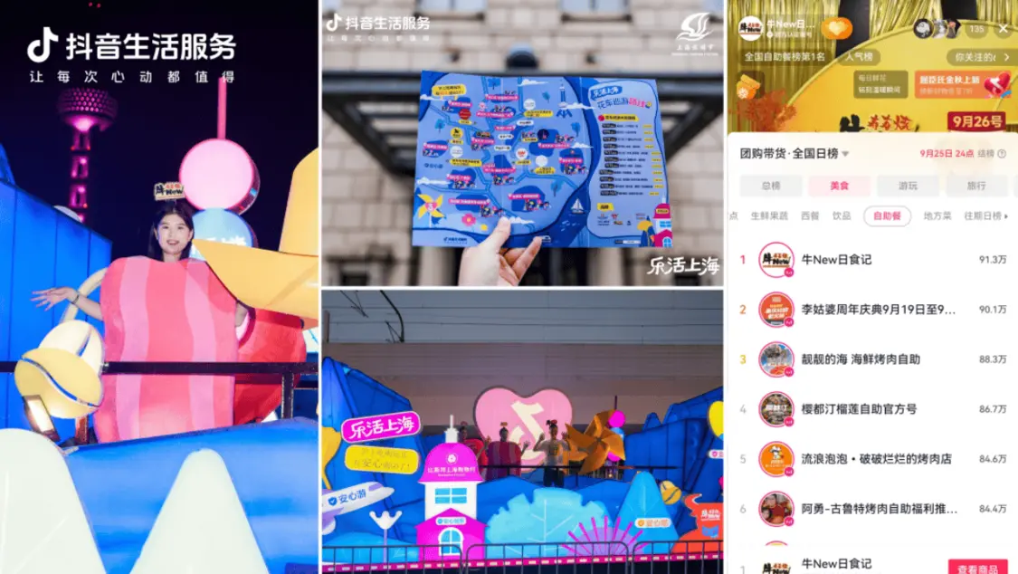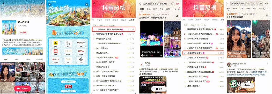 抖音生活服务积极响应「上海之夏」、「上海旅游节」等上海市年度重点活动,将平台长线城市IP#乐活上海与“上海旅游节花车巡游”、“黄圣依上海行”、“ZANMANG LOOPY魔都环游记”等优质内容深度联动。为平台用户供给丰富活动内容的同时,紧密携手牛New寿喜烧等本地品质商家,通过提供上海特色优惠团购商品,深度融合“上海旅游节花车巡游”打造具有浓郁上海特色的商圈路线。 第三季度“乐活上海”,抖音话题总体曝光突破3.6亿次,线下活动参与人数破三百万,助力城市目标合作商家交易环比增长57%。 政企共创“乐活上海”花车百花齐放 抖音生活服务首次深度参与上海旅游节中持续时间最长、最受市民游客关注活动之一的花车巡游。在历经1000公里,覆盖静安、普陀、松江、奉贤、金山、徐汇等10个区的11处知名地标、流量商圈中,累计吸引340万人次海内外游客现场观看,超过40万人次市民游客参与花车评选线上投票。 10月6日,2025年第36届上海旅游节闭幕式新闻发布会在世博文化公园温室花园举行,抖音生活服务“乐活上海”花车荣获最佳科技效果奖。 在抖音端,#乐活上海线上话题总体曝光超3.6亿,“上海旅游节25辆花车惊艳亮相”热点登上同城榜Top1,“上海旅游节显眼包”登上同城榜Top6并持续在榜一周,热点累计曝光突破1457万次,市民自发在多平台传播“乐活上海”花车。围绕花车巡游串联上海市重点商圈及核心场地,抖音生活服务特别邀请人气IP ZANMANG LOOPY、百万粉短视频达人“上海小阿姨”及平台优质商家牛New寿喜烧商家代表登上花车,参与花车巡游与市民互动。 据平台数据显示,上海位列全国暑期旅游城市榜首,“乐活上海”活动带动相关商家交易量环比增长57%,节庆红利正持续扩大消费格局。 于此同时,“乐活上海”紧密融合市、区多个政府特色项目,积极响应“我爱夜上海”并于城市核心地标日均人流量15万人次的静安丰盛里,特别携手平台优质合作伙伴凯司令、馋三尺蟹粉小笼、糖小满·冰糖葫芦·炒酸奶、香港龙凤楼等商家伙伴,通过搭建七夕“直播花车”、甜蜜市集小铺、互动礼品兑换点打造七夕特色市集活动。 在杨浦区商务委指导下,携手SMG东方购物在五角场“玩转杨数浦”白玉兰直播间内开启沉浸式直播。东方购物首场生活服务官方直播助力上扬府、京者三文鱼、凯司令、静安面包房等餐饮商家40+优质团购商品交易增长。 联合“静安音乐节AI乐之城”邀请平台商家Blac+Blac、食有把酒、食运、玺炖等9家商家伙伴,在上海利园、静安大悦城活动现场打造浪漫爱乐夏夜系列活动。平台优质直播达人涵六一在活动现场同步开启线上「超省直播」,助力餐饮商家夜间交易和全方位品牌曝光。 商家齐聚激发消费增长 第三季度期间,抖音生活服务通过专项资源供给,助力上海餐饮商家交易增长。其中,万岛、蟹珍香、丰收日、開縣徐妈串串火锅、蚝客宴、桂满陇、寄畅兴等合作商家在活动周期内收益明显,环比上双月交易增长环比均超过100%,部分商家交易环比增长达到1000%+。大馥、鸿姐老火锅、红盔甲、柠檬向右、食好点、人生一串、汉巴味德、石头先生的烤炉、the Roll'ING、胆道·海胆专门店、姚稷大铁锅、牛New寿喜烧等合作商家在活动期间,生意持续增长。 与此同时,作为上海品质商家,牛New寿喜烧、比斯特上海购物村与“乐活上海”花车共创新型传播玩法,牛New寿喜烧更是与花车巡游开启同步联动,发挥品牌传播与平台交易的最大化良性闭环。此外,通过花车巡游路线串联乐活上海CGV影城、荟品仓、金茂、KICKS、X先生MRX沉浸游戏等商家,引导用户跟随花车巡游促成到店交易。 明星达人牵引交易转化 海派明星,更懂上海。抖音生活服务特别邀请沪籍明星黄圣依拍摄“乐活上海”城市宣传片,携手“乐游上海”与上海旅游节同频共振联合宣发,为国庆、中秋双节庆交易爆发提前预热。“从上海的可爱里路出发,展现摩登魔都和烟火人间双面形象。”短片结合生活服务全场景,联动本地老字号餐饮商家——福和面馆、馋三尺及三玛璐酒楼,百联集团第一百货的逛街购物场景,以及太平洋新天地观光厅观光旅游场景,带领平台用户跟随黄圣依体验上海的多层可爱生活。 本次上海餐饮抖音消费券活动,吸引了赵奕欢、何超莲、张新成、何洁、伍嘉成、臧鸿飞、米热、林枫松等人气明星以及特别乌啦啦、上海小阿姨、大表哥995、mynameis伊森、gogo在上海、好滴多仔等优质达人资源,集结明星、达人影响力助力合作商家的整体交易及品牌曝光,#在上海吃明星同款漂亮饭冲上城市热点榜第二位。 为方便国际游客在沪消费,抖音生活服务特别请来白俄罗斯、韩国、美国、土库曼斯坦、法国等多个国家的平台达人发布双语探店视频,手把手向国际在沪游客分享游玩攻略。 美味微醺还得是沪 围绕平台用户需求及商家特色,邀请平台优质达人为合作商家提供直播服务,并联动魔都高人气特色场域打造4种具象化沪式生活。通过引入高人气IP、多元线下市集等方式打造多种新奇有趣的创意消费玩法,线下共计吸引100余万人次参与现场互动。 第一站-陆家嘴|尽兴之旅,解锁外滩chill时光 联动经典IP奥特曼,在东方明珠、上海中心大厦等地标处落线下创意装置供市民互动打卡。热点#陆家嘴追光打卡路线,荣登同城榜top1。 第二站-BFC外滩中心|治愈之