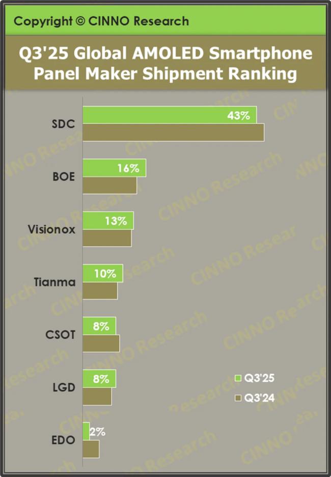 2025年第三季度,全球智能手机面板市场在苹果与安卓阵营的激烈交锋中迎来关键转折——AMOLED面板出货量飙升至2.5亿片,同比增长11.7%,环比增长20.3%。在这一轮增长浪潮中,维信诺以12.7%的全球市场份额跃居行业第三,其16.7%的同比增长率在竞争激烈的面板市场显得尤为突出。 柔性AMOLED:战场重心与格局重塑 柔性AMOLED已成为智能手机面板市场的绝对主力,第三季度在全球AMOLED市场中占比突破80%。这一技术趋势正推动全球显示产业格局的重构:韩国厂商份额同比下滑至43.8%,而国内厂商则以56.2%的份额实现反超。 维信诺柔性面板出货量同比增长16.2%,环比激增54.2%,市场份额达到13.7%。更值得关注的是,其柔性产线第三季度稼动率“显著高于行业平均水平”,显示出其在客户订单获取与生产调度上的竞争优势。 差异化破局:技术深耕与产业布局 在三星显示固守高端、京东方规模化渗透中端的常态下,维信诺选择以技术创新为核心王牌实现差异化竞争,全面发力中高端领域,推动产业结构升级。 这一战略的核心,落在其全球首创的ViP技术上。该技术突破传统FMM工艺的限制,引入半导体光刻工艺制备AMOLED像素,具备独立像素、高精度、高良率等优势,大幅提升了面板的切割效率与经济性,为拓展中大尺寸高端应用奠定基础。 为推进ViP技术的产业化,维信诺与合肥国显合作,投资550亿元建设全球首条8.6代AMOLED生产线。项目主厂房已于2025年8月封顶,预计2026年进入设备调试阶段。该产线在技术、尺寸、效率及应用方面实现全面升级,有望为平板、笔记本电脑、车载显示等市场提供更具竞争力的解决方案。 在资本层面,合肥建曙投资全额认购增发股份,持股比例升至31.89%,合肥市蜀山区政府成为实际控制人。国资的深度参与,为维信诺的长期技术投入与产能扩张提供了稳固支撑。 超越数字:全球前三的长期价值 全球前三强中两家来自中国,合计份额逼近三成,这种集体崛起正在重构全球显示产业的供应链生态和技术话语权。 从1996年清华大学的OLED项目组,到如今全球新型显示解决方案的领先者,维信诺用28年时间完成了从自主创新到市场破局的跨越。维信诺的全球第三,不仅是一组市场份额的数字,更是中国显示产业技术积淀与战略定力的缩影。 在AMOLED这场技术与资本的博弈中,其以差异化路径打开了成长空间,更以8.6代产线等前瞻布局锚定了未来竞争的制高点。 当全球显示产业的目光投向中大尺寸与车载新战场,随着与终端品牌的深度合作,维信诺的崛起之路,才刚刚开始。