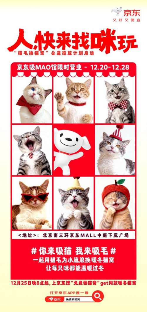 近日,京东上线生活小家电宠物专场活动,“超吸毛”的扫地机器人、空气净化器、吸尘器、洗地机等宠物清洁小家电低至5折,前往京东家电家居采销直播间还能在直播价基础上再享9折优惠,更有“买贵就送同款”的价格保障。与此同时,京东生活小家电正式启动“公益猫窝”计划,将在春节前陆续送出10000个爱心猫窝,在联合全国各地街道、社区、高校等进行投放的同时,用户也可在12月25日起的每晚8点,打开京东App搜索“免费领猫窝”限量领取,京东希望更多人能够参与到救助流浪猫的公益活动中,将“公益猫窝”放置到流浪猫聚集地,给“毛孩子”们一个能够避寒的小窝。 京东发放10000个爱心猫窝用户可免费领取投放 为救助更多小生命度过这个寒冷的冬天,京东生活小家电正式启动“公益猫窝”计划,将在春节前陆续发放10000个爱心猫窝。目前,首批联合中央财经大学、中央民族大学等五所高校进行投放救助,年底前还将联合新京报在北京八个城区的近20处社区完成公益猫窝的投放工作,希望每一个小小的窝,都能成为它们寒冬里一个安稳的“家”。 与此同时,自12月25日起的每晚8点,用户打开京东App搜索“免费领猫窝”进入活动页面,可限量领取“公益猫窝”(需支付0.01元)。京东希望更多用户能够参与到救助流浪猫的公益活动中,将“公益猫窝”放置到附近的流浪猫聚集地,为它们提供更安全、更温暖的栖身之所。 京东“吸MAO馆”限时开放参与清洁体验送猫窝 12月20日至28日,京东“吸MAO馆”公益猫咖在京东MALL北京南三环店限时开业,10只“猫咪店员”上岗。消费者到店可参与吸猫互动,并在现场体验宠物清洁家电趋势新品。京东生活小家电同步将养宠家庭的清洁需求与流浪猫过冬救助结合,用户在现场使用宠物清洁家电收集猫毛,吸到的猫毛越多,京东投放的猫窝就越多。 在京东“吸MAO馆”,大人和小孩都能深度参与到活动中,大人一边撸猫一边体验宠物清洁产品吸毛做公益,小孩子则是和“猫咪员工”玩的不亦乐乎,希望能带一只回家。一位在活动现场的家长表示,“希望京东MALL能够多搞这样的活动,让消费者在了解商品性能的同时,还能顺手做公益,孩子们也有机会和小动物零距离接触,让他们更有爱心。” 专注宠物祛味除毛京东同步上线多款清洁爆品 在“公益猫窝”计划推进的同时,京东还为养宠家庭上线了生活小家电宠物专场活动,“超吸毛”的扫地机器人、空气净化器、吸尘器、洗地机等宠物清洁小家电低至5折,前往京东家电家居采销直播间还能在直播价基础上再享9折优惠,更有“买贵就送同款”的价格保障。 其中,霍尼韦尔猫用空气净化器采用创“锌”滤料,专注祛味除毛,并通过46项权威消杀验证,甲流病毒去除率>99.99%;追觅自集尘吸尘器Z20 station旋锋版主打“割毛0缠绕”与230AW强吸力,99.99%杀菌杀毒,100天免倒尘;科沃斯T80s滚筒活水洗拖一体扫地机器人则具备16倍清洁压强、三重智能抬升,实现“一滚即净”的清洁效果。通过更完整的供给与更明确的解决方案,京东生活小家电将“吸猫的快乐”延伸为“日常更省心”的养宠体验,让用户在体验升级中持续感受养宠的快乐。 这些创新技术与产品供给的背后,是京东生活小家电对“把宠物当家人”的长期关注:以更高效的清洁能力承接掉毛、异味与地面污渍等高频问题,减少琐碎劳动与居家尴尬,把更多时间与好心情还给陪伴本身。 从“吸猫”的轻松互动,到“吸毛”的现场清洁,再到“猫毛换猫窝”的公益转化,京东“吸MAO馆”把养宠清洁升级与流浪猫过冬救助串联成一条清晰链路,让消费者在到店体验与参与中直观看到善意如何被转化;京东生活小家电“公益猫窝”计划的正式启动,也将为更多“小流浪们”提供寒冬的一份温暖,希望有更多用户打开京东APP搜索“免费领猫窝”参与到本次公益中,把爱心猫窝放置到有需要的地方。