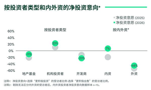 2026年中国大宗物业投资市场有望在谨慎情绪中迎来复苏 CBRE世邦魏理仕近日发布《2026年中国投资者意向调查》专题报告指出,尽管中国商业地产大宗交易市场投资者情绪仍保持谨慎,但选择"更积极投资"与"更积极出售"的受访者比例均录得小幅增长。内资净投资意向在机构投资者与地产基金推动下由负转正。资产价格的回调及预期改善,加之融资成本的降低,将进一步推升市场活跃度。 世邦魏理仕中国区总裁李凌表示:"2026年中国大宗物业投资市场有望在谨慎情绪中迎来复苏。尽管短期内宏观经济和租赁市场的调整仍将延续,资产价格回调后的估值优势,以及最近并购贷款与公募REITs分派率新规所带来的更宽松的融资环境将进一步增强多元化资本对优质商业地产的配置需求。我们建议投资者持续深耕具备抗周期韧性的租赁住宅与零售物业,并捕捉高品质物流设施的周期性窗口;与此同时,去年底公募REITs底层资产的再度扩围将为办公楼和酒店的核心资产带来新的投资机会。" 投资情绪谨慎,但交易意愿增强 报告显示,在投资意向调查中,43%的受访者表示计划在2026年采取更为积极的投资策略,而52%的受访者则倾向于更积极的出售,两项比例较上年均有所增长,预示2026年投资市场潜在交易意愿有望增强。 尽管整体市场仍以净出售为主导,但不同类型投资者的意向呈现分化趋势:机构投资者与地产基金的净投资意向有所回升,开发商受限于流动性压力,净出售意愿较上年进一步走强。分内外资看,在机构投资者和地产基金的推动下, 2026 年内资投资者净投资意向由负转正,而外资继续呈现净出售意愿。 数据来源:2026年及历年中国投资者意向调查,世邦魏理仕研究部,2026年1月 39%的受访者计划在2026年提升房地产资产配置,相比上年增长3个百分点;其中表示今年将大幅提升房地产配置的受访者占比达12%,较上年调查增长6个百分点。 在推动投资者提升房地产配置的原因中,"资产价格已有合理调整"继续排名首位,且选择此项的投资者占比(72%)较去年上升16个百分点。 工业物流、租赁住宅和零售物业仍是投资者最青睐的前三大物业类型 投资策略方面,核心型与核心增益型策略受青睐,占比合计达58%,较去年上升11个百分点。工业物流、租赁住宅和零售物业依然是投资者最关注的前三大物业类型,其中: · 工业物流:聚焦主要城市高标仓。随着供应高峰临近尾声,加之部分市场的重置成本已贴近甚至高于资产估值,该板块有望在2026年迎来周期性机会窗口。 · 租赁住宅:连续四年稳居第二,受益于私募-公募REITs链条贯通及城市更新政策支持,2025年全国租赁住宅交易额创下119亿元的历史新高。租赁住宅投资今年有望延续增长趋势,各地政府对城市更新的支持力度加大将为市场提供更多增值型投资机会。 · 零售物业:2025年零售交易额以839亿元创历史新高,除区域型购物中心外,社区商业与奥特莱斯成资产配置新选项。 数据来源:2026年中国投资者意向调查,世邦魏理仕研究部,2026年1月 在另类资产方面,投资者偏好发生显著变化。学生公寓因国内高等教育生均宿舍面积供需缺口大,上升至关注度榜首。基础设施和生命科学地产分居第二和第三位。 投资目的地方面,上海以64%的占比蝉联最受青睐城市,工业物流、零售物业与租赁住宅为配置重点。北京以22%位列第二,数据中心因AI算力需求爆发成关注焦点。二三线城市零售物业吸引力提升,公募REITs常态化发行显著增强资产流动性。 融资环境持续优化,并购贷新规助力大宗交易 融资环境方面,近八成投资者预计中国央行将在2026年进一步降息。同时,金融监管总局发布的《商业银行并购贷款管理办法》新规,提高了并购贷款的成数上限并延长了贷款期限,为商业地产大宗投资交易提供了更灵活的融资支持。 ESG理念深化,投资者对于ESG更加理性 报告指出,投资者对于环境、社会与治理(ESG)的态度正经历从"普遍关注"向"深度聚焦"的理性转型。83%的受访者已经或计划在房地产投资中采用ESG标准,其中绿色建筑、可再生能源设施和绿色融资是最受重视的ESG举措。尽管投资者对ESG资产的溢价认同度有所回落,但绿色资产在吸引和留住租户方面的竞争力依然显著,有助于提升项目的现金流表现。世邦魏理仕在2025年对国内一线城市578栋办公楼租金和出租率量化分析证实,绿色认证楼宇享有0.7%-2.4%的租金溢价,同时平均出租率高出非绿色楼宇3.7个百分点。 免责声明 除特别注明或提示,以上所有内容仅供阅读者参考之用,不作为唯一决策依据。相关信息之知识产权均属世邦魏理仕所有,所有权利受法律保护。基于信息发布时所掌握的情况,以世邦魏理仕所知,所刊载信息及预测真实且无误导。世邦魏理仕未对此信息进行进一步核实验证,亦不对上述信息做出任何保证。阅读者如参考、使用或依赖上述信息,应对上述信息的准确性、真实性和完整性进行独立审查。世邦魏理仕不对阅读者和任何第三方使用或依赖以上信息, 或者/以及作出商业决策而导致任何损失和费用或任何其他后果承担任何责任。 关于世邦魏理仕 世邦魏理仕(纽约证券交易所代号:CBRE)是财富500强和标准普尔500强企业,为全球性的地产服务和投资公司。公司拥有员工超过140,000名,在全球100多个国家和地区为投资者、广泛的企业用户及各类资产地产业主提供服务。CBRE通过四大业务分支提供
