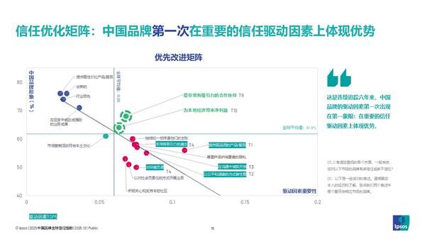 根据益普索长期追踪的全球趋势变化,我们发现:持续性的紧张态势已成为2020年代的鲜明注脚。与此同时,对大型机构的信任正转移至更小的圈层或个体,「信任的力量」日益成为关键。全球77%的受访者表示更倾向于信赖熟悉品牌的新产品。于品牌而言,赢得信任,就等于拿到了进入消费者核心圈层的钥匙。 自2019年起,益普索持续追踪中国品牌的全球信任表现。《2025中国品牌全球信任指数(GTI)》基于20个主要出海市场中16,000名消费者的反馈,清晰勾勒出中国品牌全球影响力稳步提升的轨迹。 全球市场中,中日韩品牌净信任度持续上扬。2025年,中国品牌全球净信任度达到32%,较2024年大幅上升12个百分点。 即使在相对保守的发达市场,中国品牌净信任度一年内也增长了12个百分点,首次摆脱负值区间。2025年,发达市场对中国品牌信任比例升至36%,不信任比例下降6个百分点。 英美市场对中国品牌的净信任度保持大幅上升。英国受访者信任比例从2021年的29%攀升至2025年的49%;美国亦有48%的受访者表示信任中国品牌,较2024年同比增长6个百分点。 中国品牌正迎来在发达市场穿越信任临界线、实现影响力跃升的关键节点。 2025中国品牌全球信任指数排行榜 消费电子持续领跑,智能家电稳步前进 · 与2024年相比,2025年中国品牌全球信任指数排行榜的前6名排位格局保持稳定,各品牌信任指数无明显变化; · 排位前10名中有6家品牌来自消费电子行业,荣耀的信任指数及排名均有所提升; · 以海信、海尔、TCL、美的为代表的智能家电品牌的信任指数及排名呈现上升态势。 知名度驱动跃升:比亚迪、Temu上升迅速,名创优品新晋前二十 · 名创优品凭借广泛的全球门店网络,首次入围即位居第15位; · 比亚迪因品牌认知度大幅提升,排名从第23位跃升至第16位; · Temu在电商平台整体受关税波动等影响导致信任指数回落的背景下,凭借知名度大幅攀升,排名从第29位提升至第20位。 中国品牌信任驱动因素 2025年,驱动海外消费者信任中国品牌的前五大因素依次为:「提供高品质的产品/服务」、「以公平和道德的方式做生意」、「在沟通中诚实开放」、「对环境负责」 以及 「非常有吸引力的雇主」。 新增因素 「在沟通中诚实开放」 跻身前三(7.6%)。此外,「始终如一地传递主张」、「为本地经济带来净利益」等因素重要性均有所上升。消费者对中国品牌的评价标准趋于全面,已超越单一的产品品质,扩展到沟通、合作与社会责任等多维度。 关键驱动因素表现取得突破 2025年,中国品牌在「是非常有吸引力的合作伙伴」以及「为本地经济带来净利益」这两大重要驱动因素上的表现获得了全球消费者的认可。这也是连续追踪六年来,中国品牌的信任驱动因素第一次出现在第一象限:在重要的信任驱动因素上表现良好。 中国品牌在「创新的」、「行业领先」和「提供高性价比产品/服务」等硬实力方面的表现依然亮眼,但在「以公平和道德的方式做生意」、「以对社会负责任的方式开展业务」等软实力方面,中国品牌形象表现还有待提升。这些因素关乎品牌的社会价值与可持续发展,需要重点关注和长期持续投入。 传播渠道的信任效力差异 全球消费者获取品牌信息的主要渠道前五名为:社媒广告(59%)、电视广告(46%)、搜索引擎广告(37%)、电商站内推广(35%)、流媒体广告(33%)。社媒广告在新兴市场触达效力尤为突出(65%)。 不同渠道对品牌信任的影响效果各异。明星代言和KOL推广是潜在风险最高的渠道,虽能提升部分消费者信任(54%,45%),但也有9%的消费者表示可能因此降低信任。相比之下,体育赛事赞助与电商站内推广的信任安全度更高,认可其能提升信任的受访者比例达58%。 从市场差异来看,新兴市场受访者对营销态度更为开放,容易对传播渠道传递的信息产生信任,形成相对友好的沟通环境。而发达市场受访者对广告信任阈值较高,反馈更为审慎。体育赛事赞助与电视广告在发达市场中对中国品牌信任提升效果突出(受访者认可比例达40%),传统权威传播渠道在成熟市场仍具备强大的信任背书能力。 穿越临界线 中国各行业品牌已在全球市场建立起可与欧美品牌抗衡的声誉与信任。与此同时,全球消费者正以更全面的维度审视中国品牌,信任的驱动因素日趋多元。这要求品牌建设的逻辑从过去的「技术参数竞争」转向「情感联结的构建」。 当前,全球信任格局正在重构,为中国品牌出海打开了新的机遇窗口。中国品牌需跨越关键门槛,实现从市场接纳到全球信赖的跃升,以更具影响力的姿态,开启全球化发展的新阶段。 关于益普索Ipsos 益普索是全球最大的市场研究和咨询公司之一,业务遍及全球90个市场,员工超过20,000人。自2000年进入中国市场以来,益普索始终以专业洞察赋能商业决策,为快消、金融、汽车等数十个行业的头部企业提供高质量服务,聚焦趋势前瞻、定位、创新、品牌、渠道、体验等商业问题,促进企业实现增长。