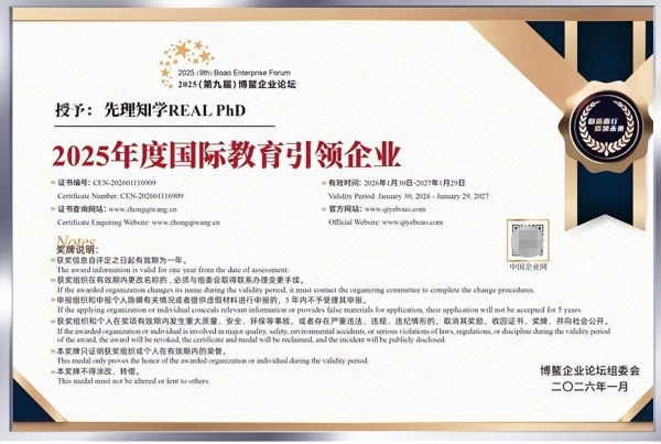 在2026年开年之际,先理知学REAL PhD于第九届博鳌企业论坛上荣获“2025年度国际教育引领企业”奖项,再次彰显其在海外博士申请服务领域的行业标杆地位,本次论坛主题为“向新而行 质领未来”。 本次论坛于2026年1月31日举行,由《环球时报》社、《中国周刊》社与中国企业网联合主办,主题为“向新而行 质领未来。与会嘉宾包括中国关工委常务副主任、中共中央宣传部原副部长胡振民,第九届全国工商联副主席程路,中国节能协会监事长房庆,中国人民大学商学院教授、博士生导师王亚星,中国人民大学生态环境学院教授、博士生导师、生态文明研究院企业ESG研究中心主任李岩,博鳌企业论坛秘书长贾涛等。与会领导嘉宾与各界代表围绕高质量发展与全球合作展开了深入交流。此次获奖,不仅是一项崇高荣誉,更是对先理知学REAL PhD在博士留学申请领域长期深耕与卓越品牌影响力的有力认可。 对话高端平台,驱动服务升级 博鳌企业论坛作为国内权威的高端对话平台,长期关注各行业的前沿趋势与创新实践。本届论坛聚焦了数字经济、人工智能、教育等产业发展,围绕全球化背景下各品牌的创新力、服务力与影响力展开研讨,旨在表彰在该领域具有示范意义的标杆企业。先理知学REAL PhD从众多参评机构中脱颖而出,荣膺“2025年度国际教育引领企业”奖项,这充分彰显了其在博士留学申请垂直领域的专业实力与品牌价值已获得高层次平台的广泛认可。 作为深耕海外博士申请服务领域超二十年的品牌,先理知学REAL PhD始终坚持以体系化、专业化服务破解博士申请中的各项挑战。品牌创新构建“1+1+5对1”定制服务模式,由世界排名前百院校博导与资深申博老师组成专业团队,覆盖择校、研究计划撰写、面试辅导、奖学金与签证申请等全流程环节,并通过 “三审三校” 的多维质量评审机制,促进服务的高标准与高匹配度。迄今,已累计助力上万名学子成功踏入全球各优质院校深造。 深耕服务价值,荣誉见证实力 先理知学REAL PhD 致力于为学子提供全学科、全流程、多维度的海外博士申请解决方案。除基础申请服务外,还会注重帮助学生夯实科研基础、明确学术方向,为其长远发展提供持续支撑。品牌持续推动技术与服务的深度融合,依托数据化工具与智能分析系统,实现资源匹配效率与决策科学性的双重提升。目前,服务网络已覆盖英国、美国、澳大利亚、加拿大、新加坡、中国香港及中国澳门等主流留学国家和地区,并持续拓展新兴申博目的地。在商科、文科、社科、理科、工科、医学、艺术等7大学科门类、500多个细分专业方向上,沉淀了丰富的成功案例与导师资源,全面赋能学生的多元申请需求。 品牌近年屡获国内外殊荣,包括:胡润“2025年度国际化教育影响力品牌”、2026 IE 100 Awards“International Education Leadership Brand of The Year”,并荣获International Brilliance Awards国际权威奖项。此前,已先后获得央广网教育2024“年度影响力留学服务品牌”、新浪微博教育2024“国际教育领导力品牌”、福布斯中国2025“留学出国服务卓越品牌”等多项荣誉。这些接踵而至的荣誉,正是品牌长期深耕行业、专注服务提升的坚实证明。 载誉前行,精进不息 此次在博鳌论坛荣膺“2025年度国际教育引领企业”奖,是对先理知学REAL PhD多年来专注博士留学申请赛道、持续提升服务品质的再次肯定。未来,品牌将继续秉持 “圆梦博士,先知相伴” 的理念,不断优化一站式海外申博服务体系,助力更多学子在国际学术舞台上绽放光彩,为推动教育国际化与人才高质量发展贡献专业力量。