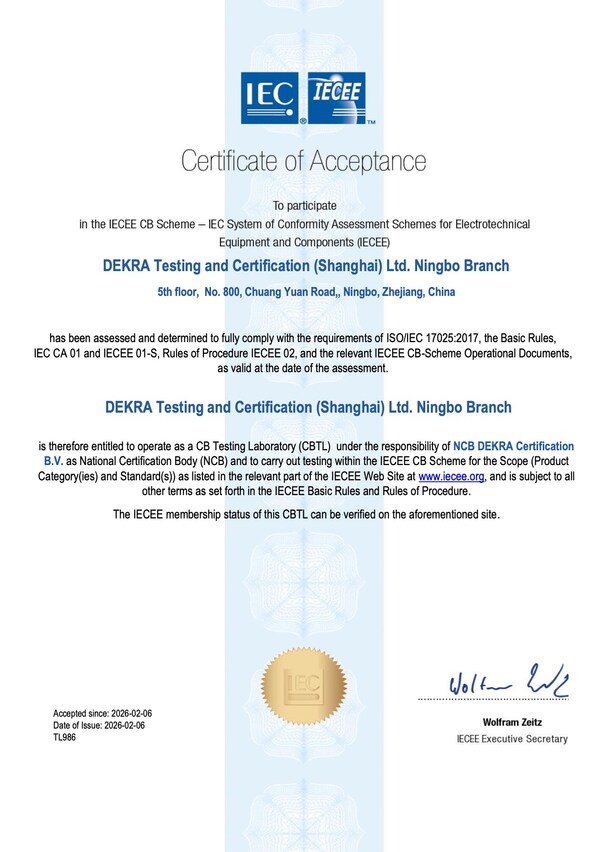 中国唯一:DEKRA德凯宁波荣获电源轨道CBTL