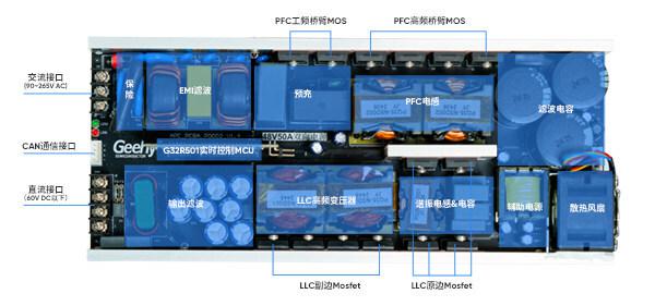 双向电源控制技术广泛应用于户用储能、便携式储能和电动汽车等应用,在能源使用效率备受关注的今天,双向电源必须满足更高的效率和可靠性标准,高转换效率已成为数字电源市场竞争的关键,这不仅顺应全球节能减排的趋势,也对促进电子设备小型化、集成化起到关键作用。 近年来第三代半导体材料如碳化硅(SiC)和氮化镓(GaN)在数字电源中的应用逐渐崭露头角,推动电源向小型化、高效化方向迈进,但与传统硅基半导体材料相比,其成本依然较高,这在一定程度上制约了其在大规模应用中的普及速度。 AC/DC数字电源电路的拓扑结构通常由前级功率因数校正(PFC)和后级隔离型直流/直流(DC/DC)变换器组成,通常需分别由两颗实时微控制器进行控制,存在以下问题: · 芯片间的通信和数据交换实时性不足; · 系统设计相对复杂,一定程度上增加选型、采购、升级、维护成本。 针对电源行业对高效率、低成本以及双向工作能力的迫切需求,极海推出了全数字双向电源参考方案。该方案采用单颗G32R501实时控制双核MCU,基于两相交错的图腾柱PFC和LLC谐振变换器,结合传统硅MOSFET,实现两级变换器双向软开关工作,为实现高效率、低成本的双向数字电源解决方案提供了选择。 极海G32R501全数字双向数字电源参考方案介绍 极海G32R501全数字双向电源参考方案,具备高效率、高可靠、高转换率、低噪声和高性价比等特点,同时配备全面的输入/输出保护和软启动功能,适用于通信电源、服务器电源、便携储能电源等多种场景。 该电源由两级功率拓扑单元组成,前级为两相交错图腾柱功率因数校正(PFC)电路,采用600V传统的硅功率MOSFET;后级LLC谐振变换器采用原边全桥结构,并通过两个变压器分摊损耗,副边由两组全波同步整流电路并联构成。 G32R501全数字双向电源参考方案实现框图 G32R501全数字双向电源参考方案部分参数 G32R501全数字双向电源参考方案优势: · 单芯片高算力控制: G32R501主频高达250MHz,可在单核内实现两级变换器控制环路; · 集成模块化设计:G32R501内置PWM、COMP和CAP等,通过高速霍尔芯片采集电感电流,无需外部过零检测,支持峰值电流灵活控制两相交错图腾柱PFC(临界模式),实现PFC全工作范围的软开关,有效避免MOSFET反并联二极管的反向恢复损耗; · 高效能量转换:AC-DC和DC-DC两级变换器,支持软开关和双向控制,整流/逆变模式峰值效率>96.5%,额定工作效率>96%,各工况效率完全符合80Plus钛金标准; · 灵活输入输出:高效转换单相交流输入电压至直流输出电压,支持适宜电压范围内对电池系统恒功率充放电; · 闭环交错并联技术:实现两相变频脉冲180°交错控制,降低电流纹波和谐波,提升轻载效率; · 快速保护与散热:电源具有快速响应保护功能,配合可调速风扇散热; · 实时监控与调整:支持与上位机连接,可通过上位机实现运行监控、参数调整和程序升级。